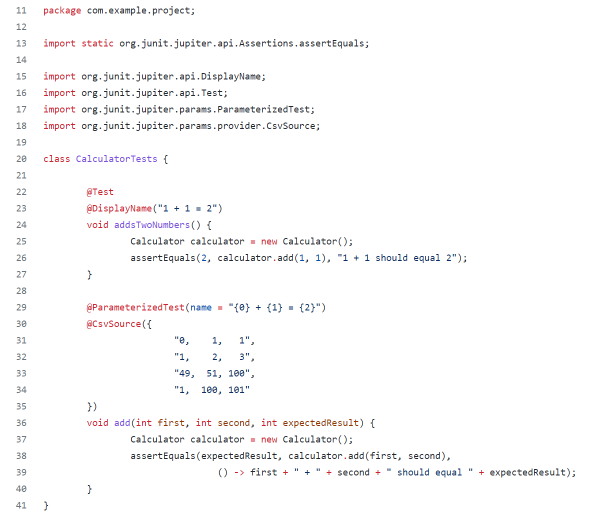 - @ParameterizedTest는 하나의 테스트 메서드로 여러가지 parameter를 테스트할 수 있다. @CsvSource의 값을 parameter로 넘긴다.