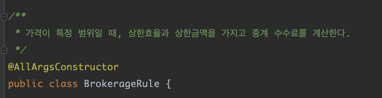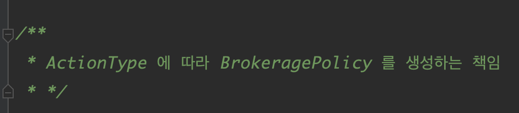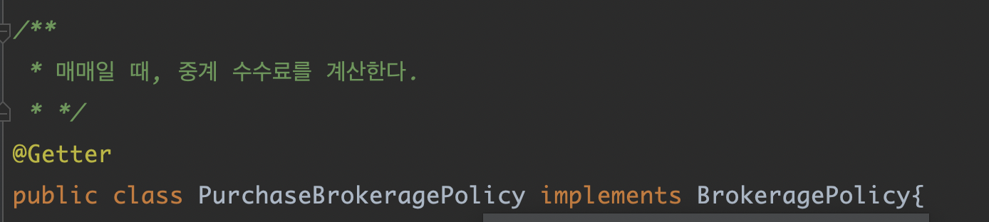 객체의 용도와 목적을 명확하게 가져가고 싶었다. 처음에는 각각의 Rent(임대), Purchase(매매) 정책 을 가지고 있는 객체였다. 리팩토링을 하다가 Brokerage 를 리턴하는 calculate 코드가 중복되길래 해당 부분을 BrokeragePolicy 인터페이스로 추상화시켰다. 추상화가 어쩔 수 없이 탑-다운이 아닌 바텀-업 방식일 수밖에 없다는 말이 이해갔다.