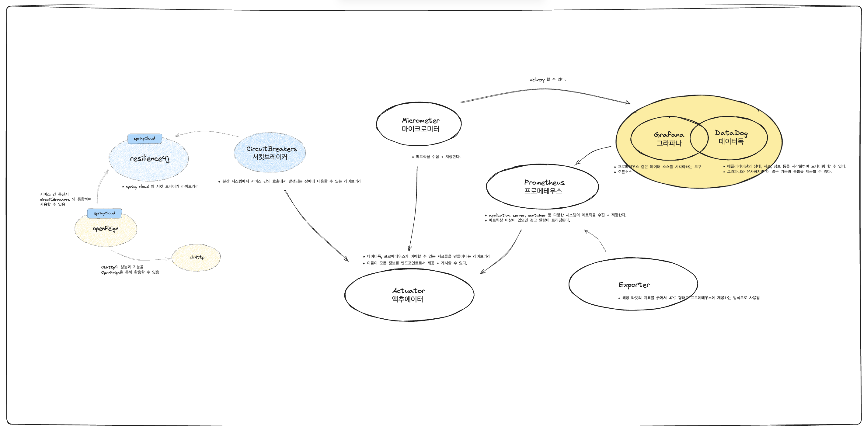 `resilience4j` 는 Spring Cloud 반열의 서킷 브레이커 구현 라이브러리입니다. 서비스 간 통신시 사용되는 `openfeign` 과 통합하여 서비스 간 통신시 장애 상황이 발생하면 그 전파를 막을 수 있습니다. 이 모든 설정과 각 라이브러리의 상태를 `actuator`가 게시합니다. `actuator` 는 Spring Boot에서 자체적으로 제공해주는 애플리케이션을 모니터링하고 관리하는 기능입니다. 내부적으로는 메트릭 파사드인 Micrometer에 대한 종속성 관리 및 자동 구성을 제공합니다. 데이터독, 그라파나와 같은 메트릭 시각화 역할을 `actuator` 가 미약하게나마 맡고 있다고 이해했습니다.