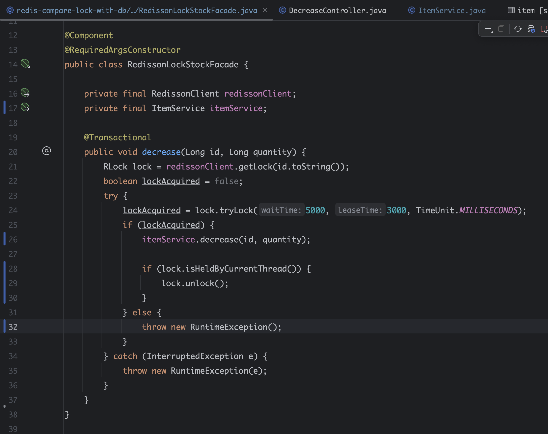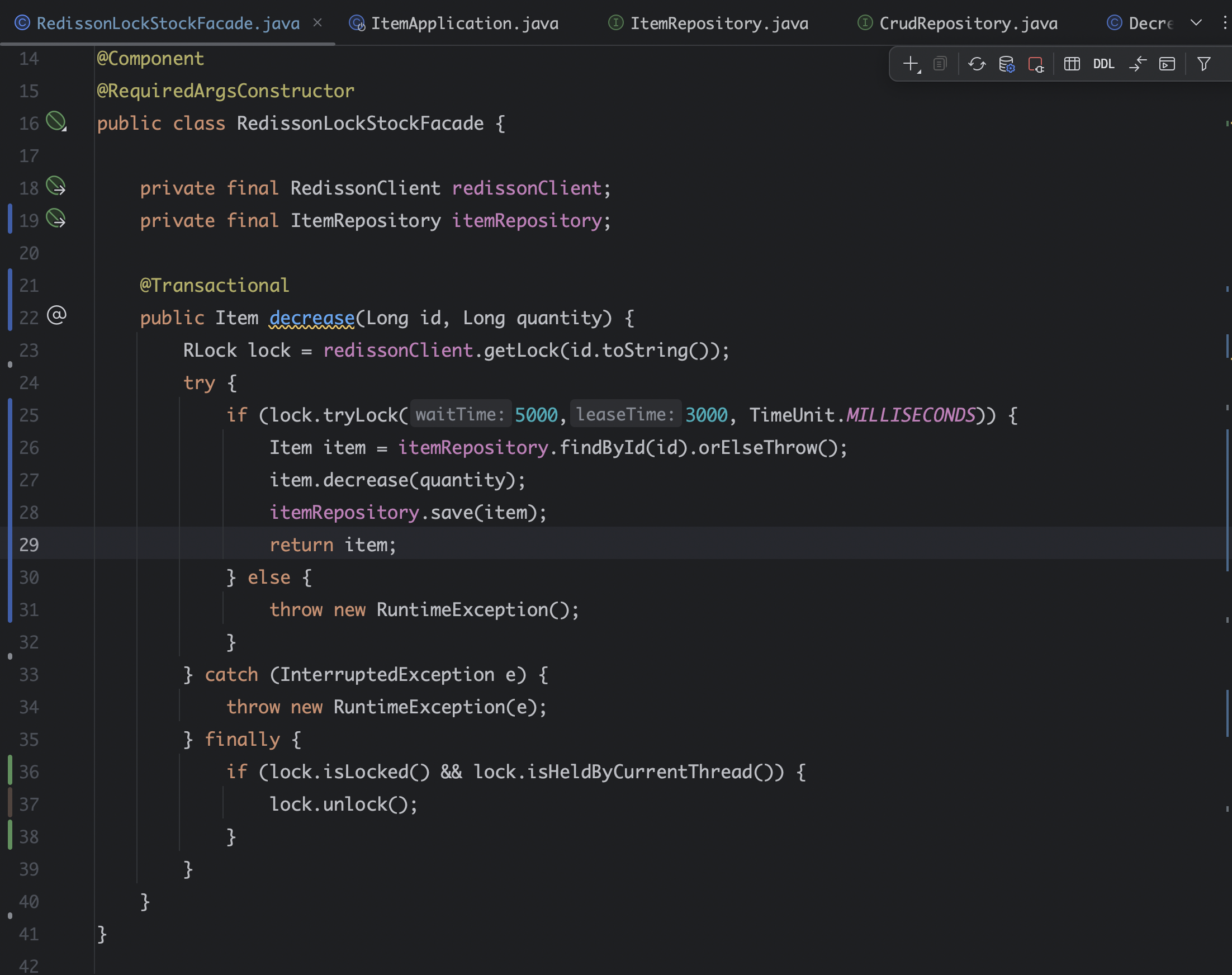 redission 으로 분산락을 구현한 코드는 여기에 더 자세히 살펴보실 수 있습니다.