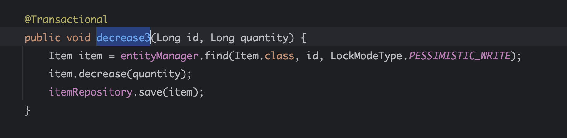 참고로 Optimistic Lock 는 flush 되는 시점에 version 속성의 값을 비교하는 방식이기 때문에 retry 구현이 추가적으로 수행되어야할 수 있습니다. 비관적 락은 어떻게 다른지 비교해보겠습니다.