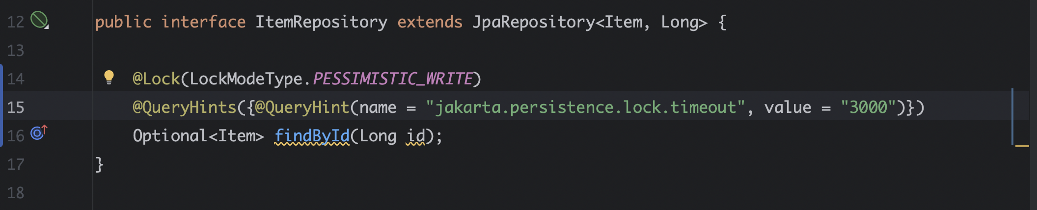 기본 정의된 QueryMethod 로 돌아가서 findById 조회 이후 해당 entity 를 entityManager.lock() 을 통해 lock 을 획득해보겠습니다.
