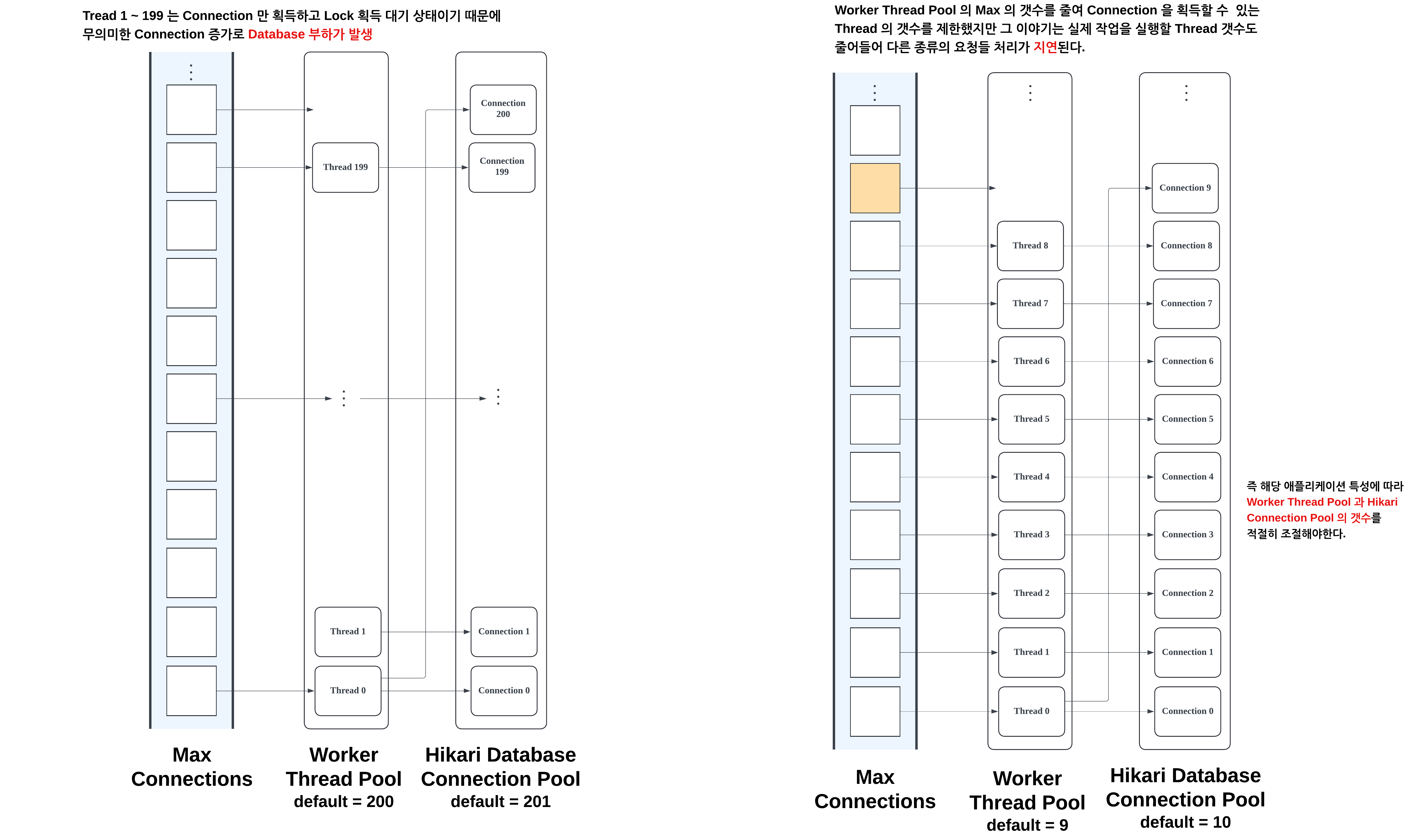 Worker Thread Pool 의 Max 개수를 줄여 Connection 을 획득할 수 있는 Thread 의 개수를 제한하면 실제 작업을 실행할 Thread 의 개수도 줄어들어 다른 종류의 요청 처리가 지연됩니다.