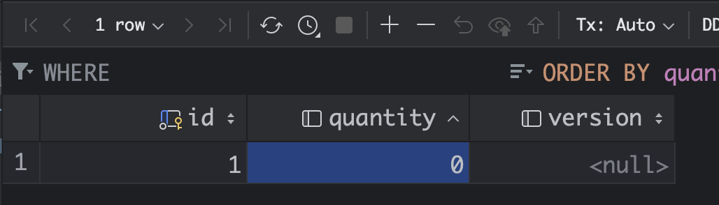 예외는 ObjectOptimisticLockingFailureException 입니다. 해당 예외는 Spring 애플리케이션에서 Hibernate 를 사용하면서 발생하는데요. 충돌 업데이트를 방지하며 데이터 무결성을 보장하는 이 방식은 낙관적 락을 통한 동시성 제어 매커니즘입니다. ObjectOptimisticLockingFailureException 은 데이터 베이스의 버전이 update 쿼리에서 지정한 버전과 일치하지 않기 때문에 예상한 업데이트가 발생하지 않도록 하는 예외입니다. statement executed: update item set quantity=?, version=? where id=? and version=? 은 id 와 version이 일치하는 행에서 item을 update 하려고 했던 시도입니다. 이 시도에서 결과는 다음과 같습니다.