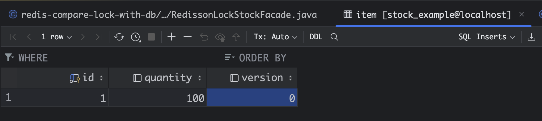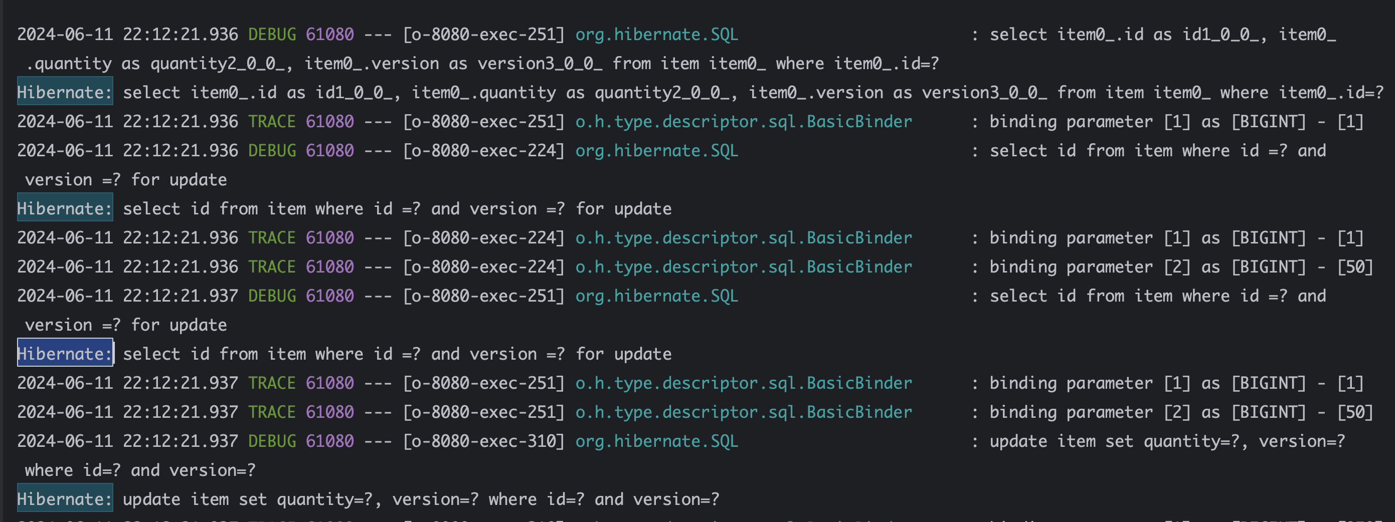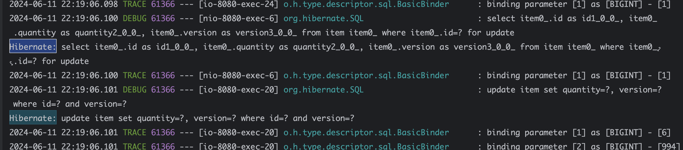 Hibernate: select i1_0.id,i1_0.count,i1_0.name,i1_0.version from item i1_0 where i1_0.id=? for update Hibernate: update item set count=?,name=?,version=? where id=? and version=?