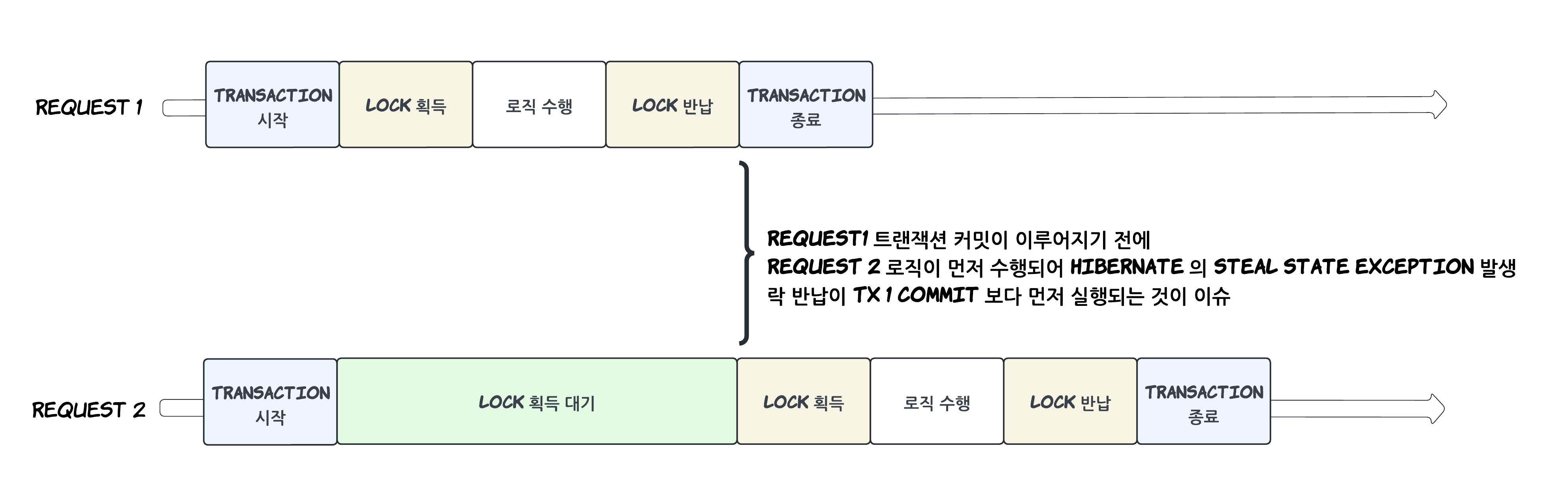 요청 1과 요청 2가 있습니다. 요청 2는 요청 1이 선점하던 Lock 이 반납되자 마자 획득하여 로직을 수행합니다. 이때의 데이터는 요청 1이 읽던 데이터와 동일합니다. 트랜잭션이 아직 종료되지않아 commit 이 안됐기 때문입니다. hibernate 에서 StealStateException 이 발생하는 이유입니다. 요청 1의 lock 반납과 트랜잭션 순서를 로그로도 파악해보았습니다.