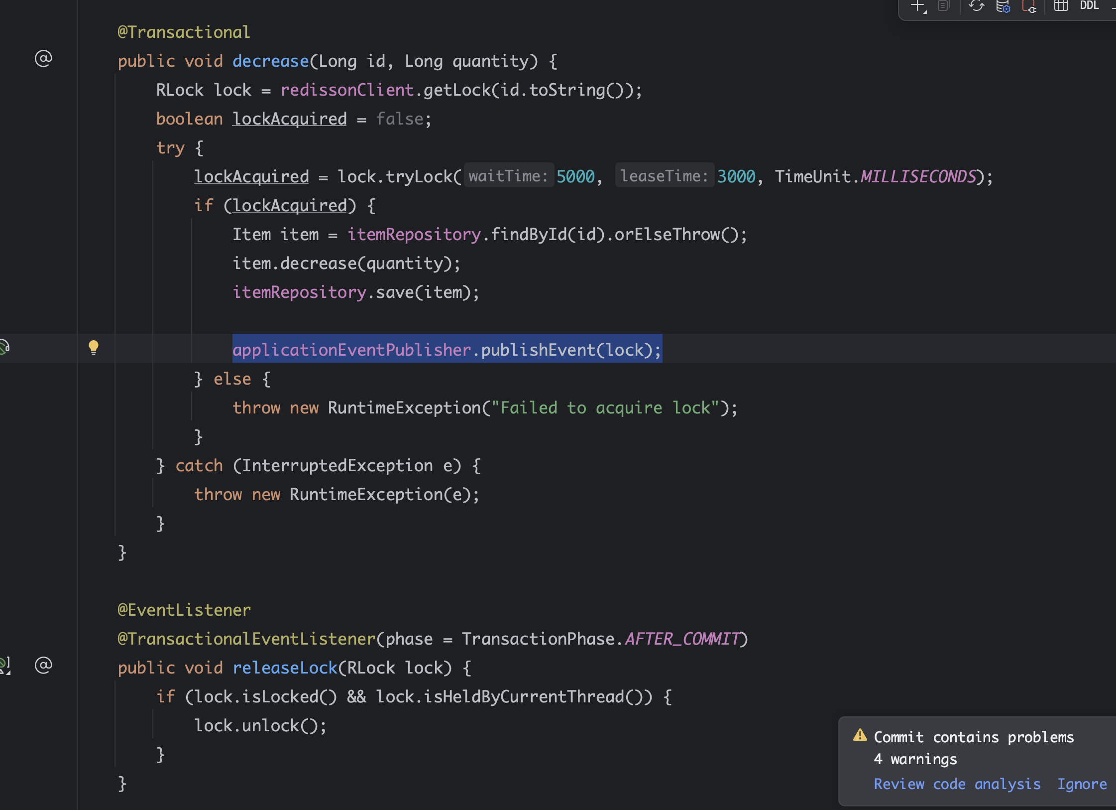 사실 트래픽이 아주 아주 많아서 다중 서버가 띄워진 환경 + 트랜잭션이 많이 일어나는 서비스라면 Redis 를 이용한 lock 을 사용하는 것이 이론상 바람직해보이긴 하네요...