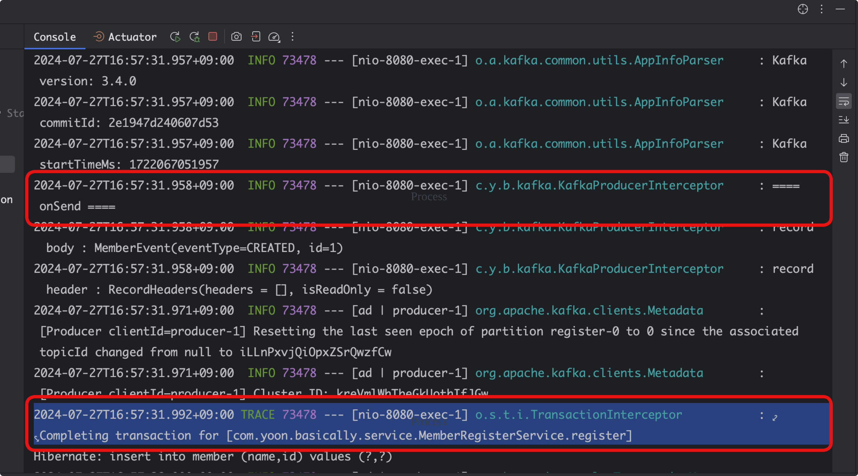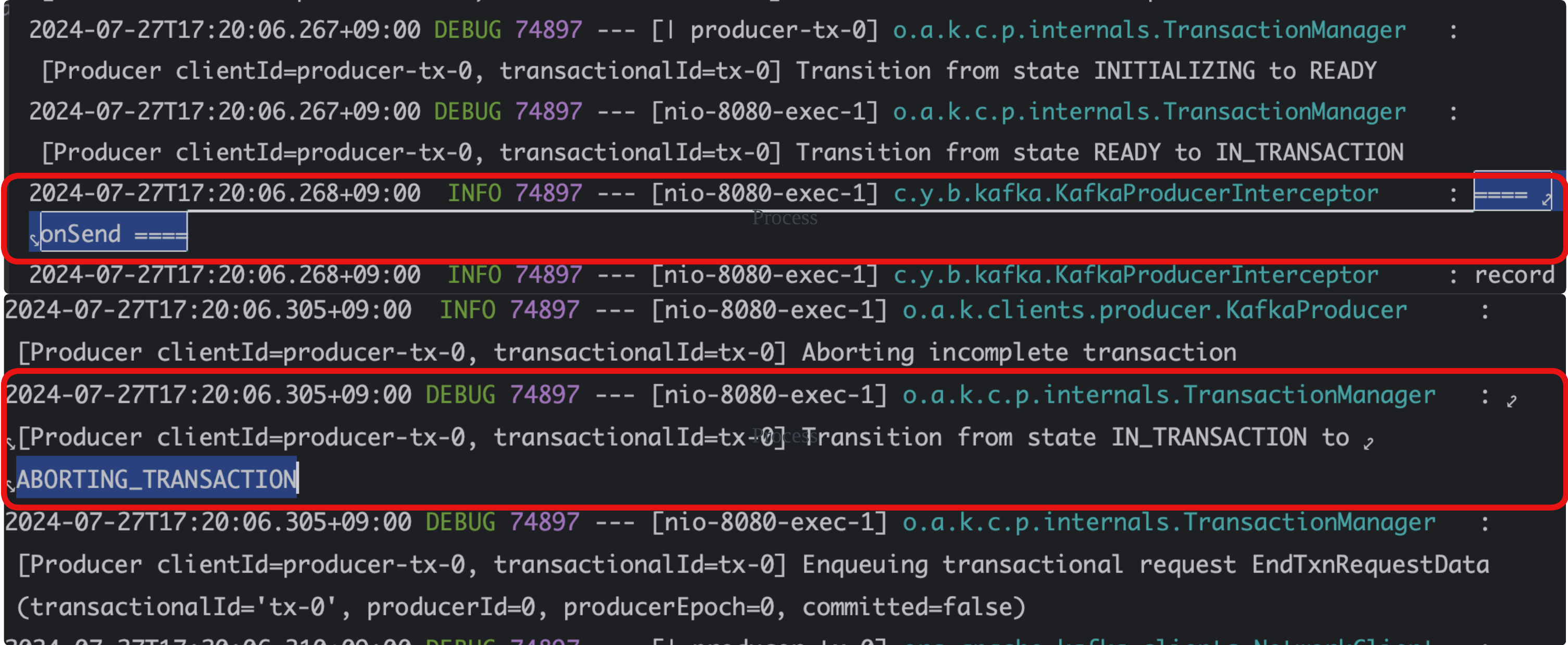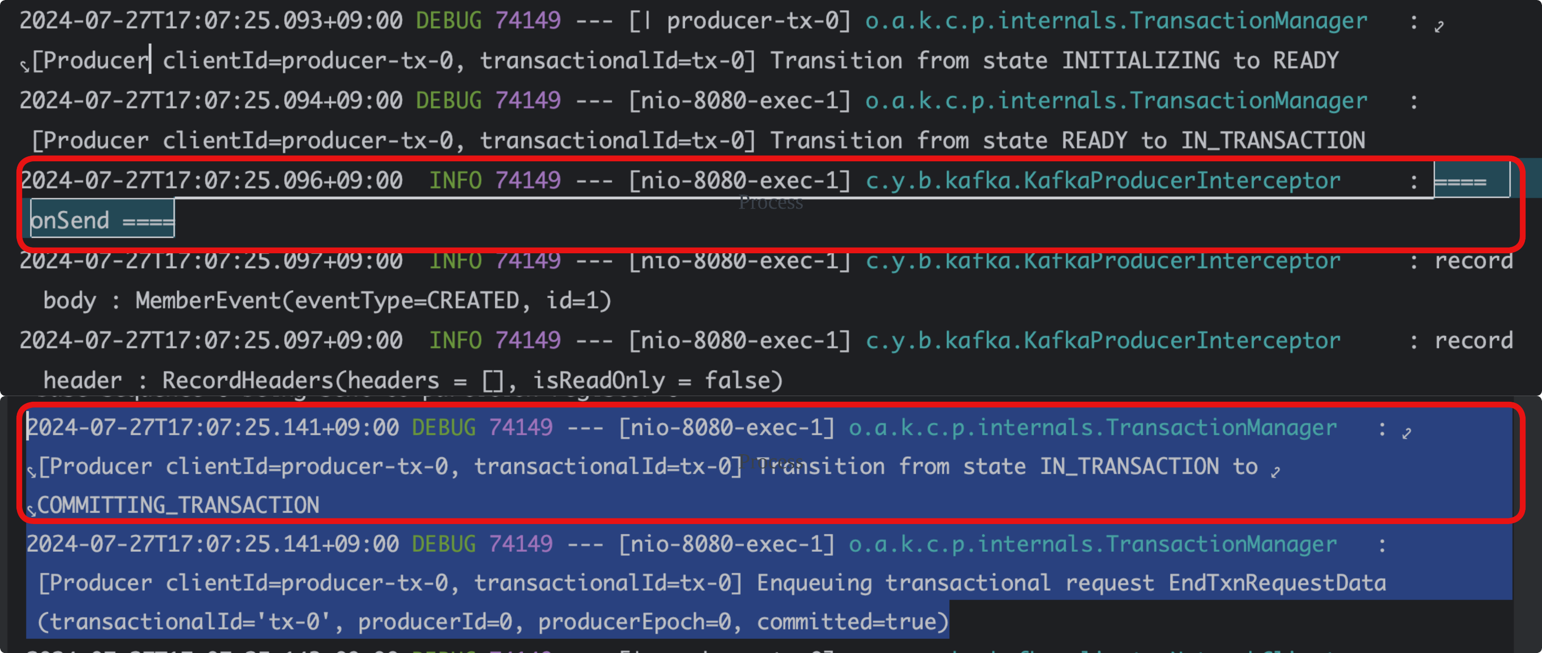 어찌됐든, DefaultKafkaProducerFactory 에 TransactionIdPrefix 를 설정하게 된다면 Kafka Transaction 으로 동작하게되며 이벤트는 KafkaTemplate.send 라인에서 바로 발행되지만 Spring Transaction 이후 해당 이벤트가 Commit 됩니다. 해당 설정으로 로그를 살펴보았습니다.