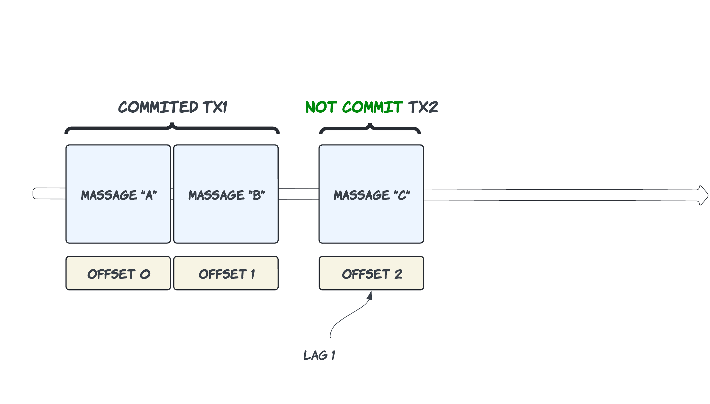이 경우, 컨슈머는 offset 1 까지의 메세지만 읽을 수 있으며 offset 2 에 있는 메시지는 커밋되지 않았으므로 읽을 수 없습니다. 따라서, 컨슈머 그룹의 lag 는 1이 됩니다.