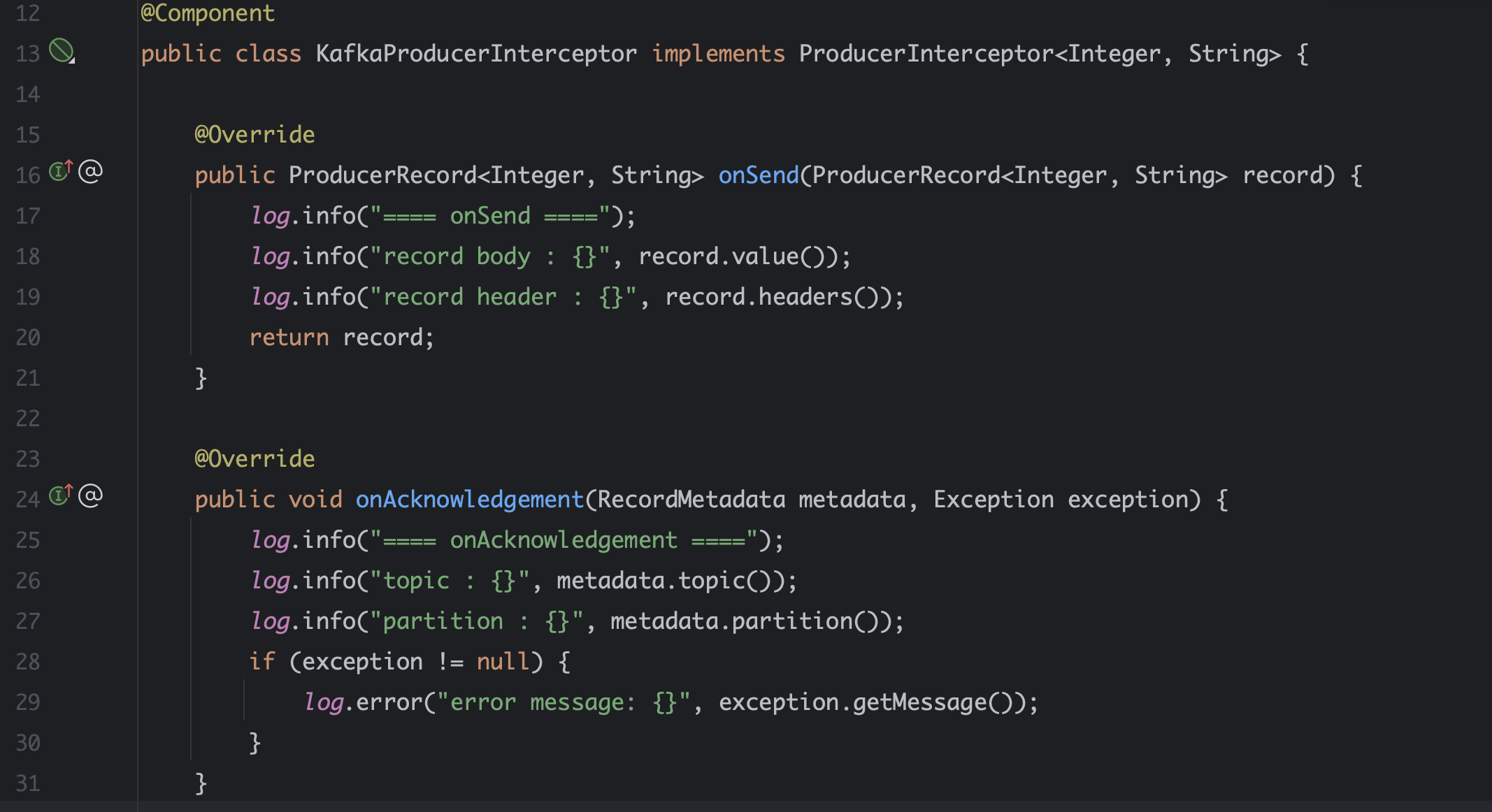 ProducerInterceptor 는 프로듀서 클라이언트에서 사용되는 인터셉터로, 메세지가 kafka 브로커로 전송되기 전에 특정 로직을 실행할 수 있도록 해줍니다. 아래 사용처로 이용해볼 수 있을 것 같습니다.