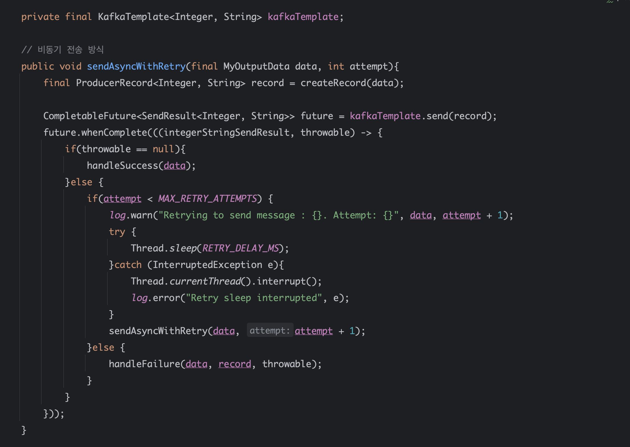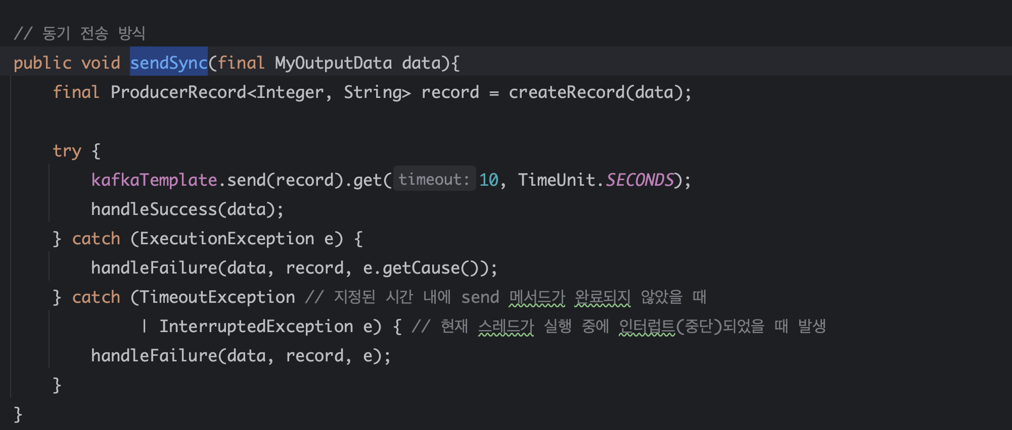 KafkaTemplate 의 Message 전송은 기본적으로 CompletableFuture 비동기로 진행되지만, 아래와 같이 Blocking 구현을 통해 동기식 전송도 가능합니다.