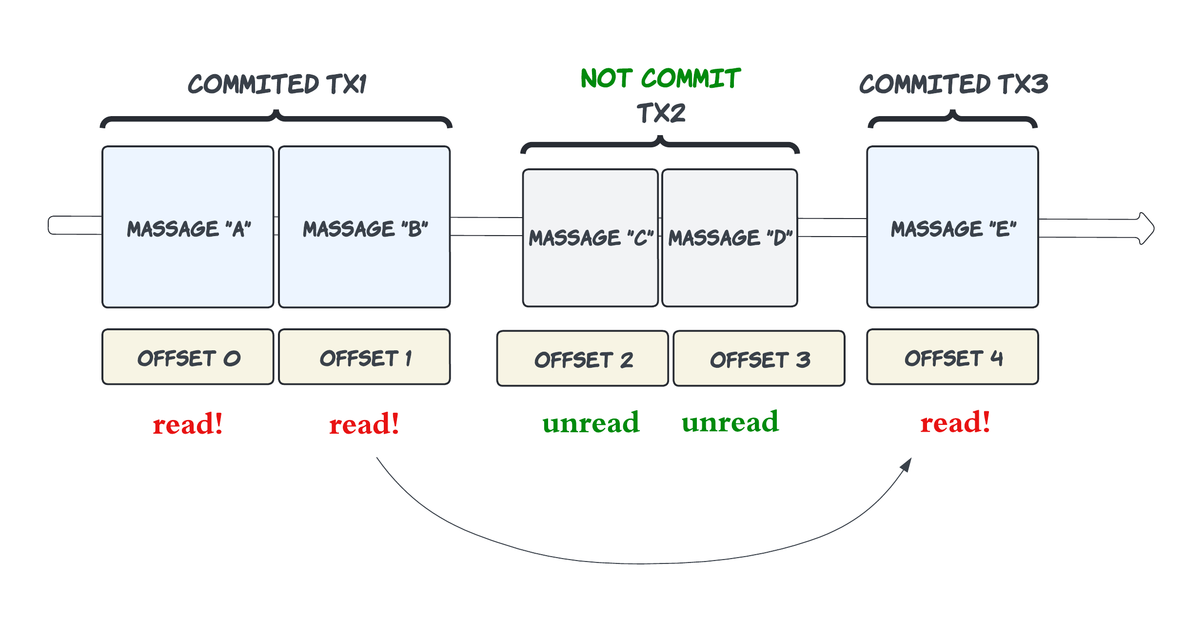 만약 트랜잭션 1이 커밋되고, 트랜잭션 2가 아직 커밋되지않은 상태라면, 컨슈머는 메세지 A와 B만 읽습니다. 이 경우 메세지 B의 오프셋 다음에 읽을 수 있는 메세지는 C 가 아닌, E 입니다. 트랜잭션 2가 커밋될 때까지 건너뛰는 방식입니다. 메시지의 순서가 보장되어야하는 경우, 취약점입니다.