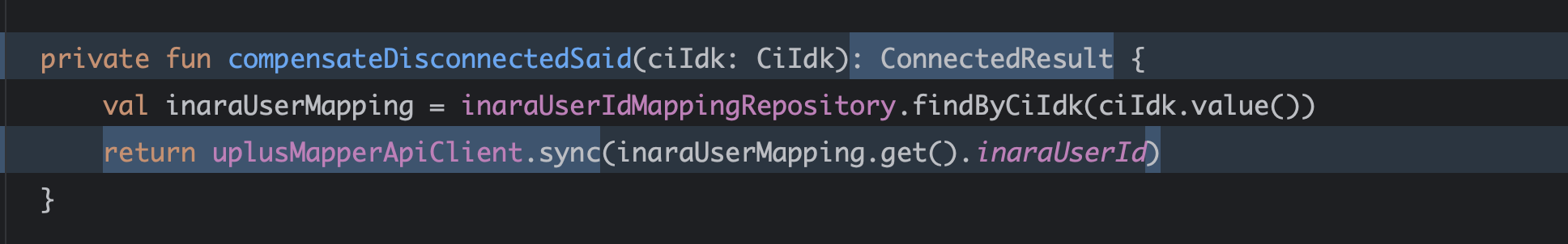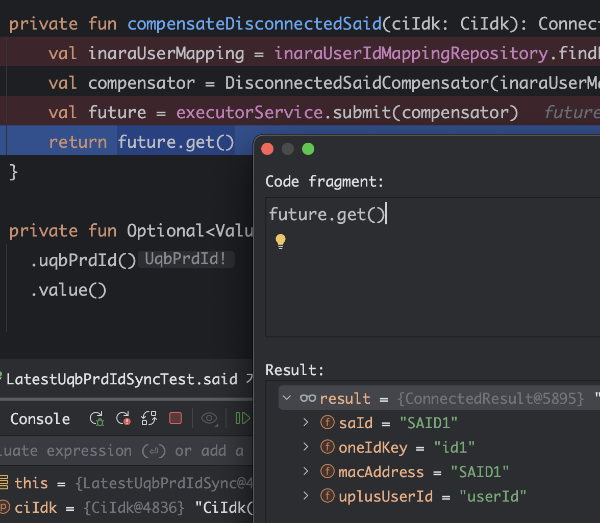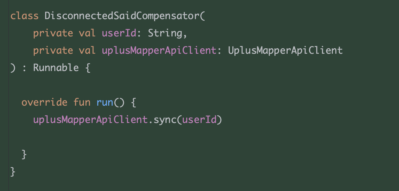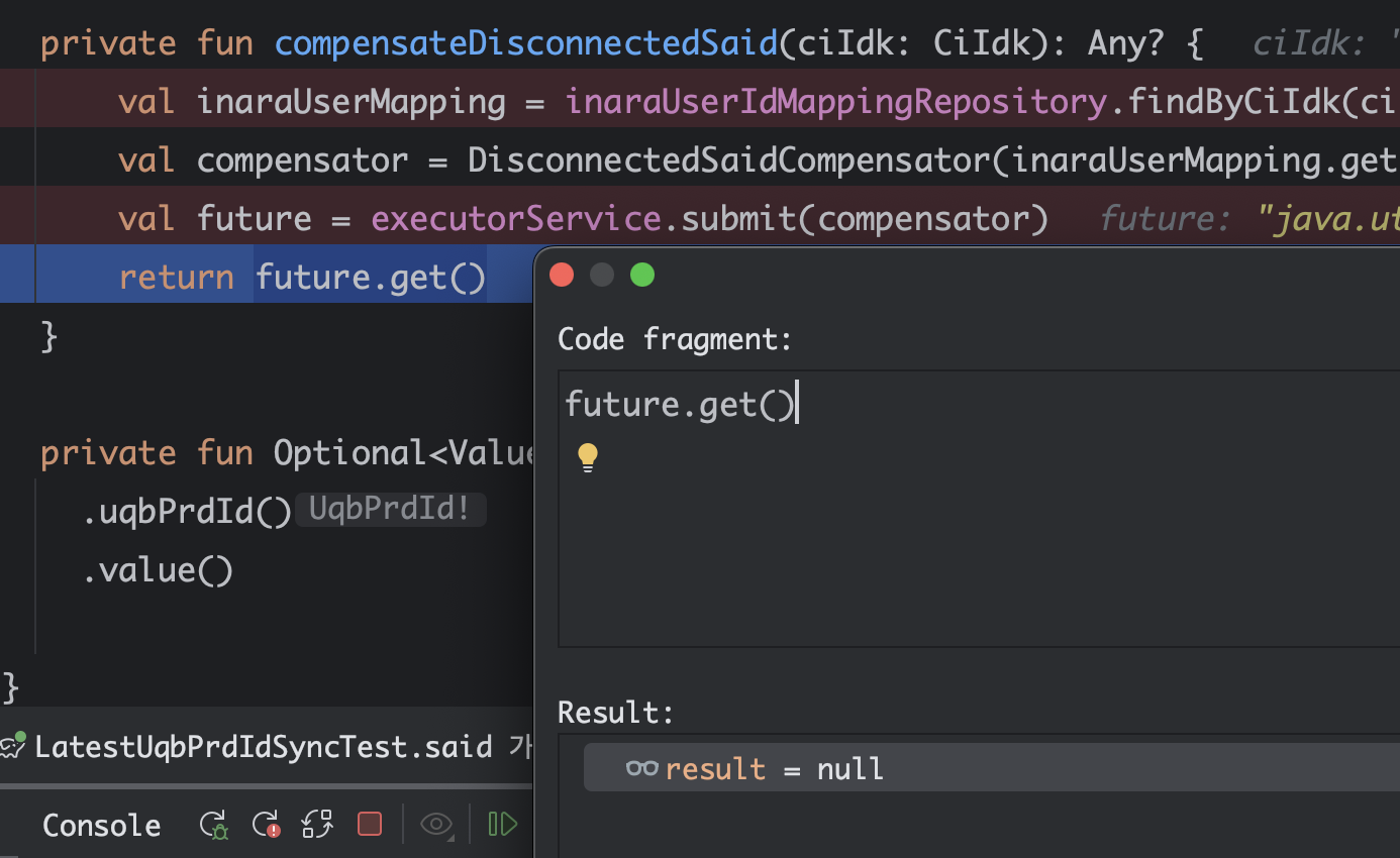 DisconnectedSaidCompensator는 Runnable 인터페이스를 구현하며, 사용자 ID를 기반으로 클라이언트 API를 호출해 보정 작업을 수행한다. 근데 여기서 문제가 또 있는게, 재연동 후 변경된 유저 정보를 알아야했다. 그래야 뒷처리를 할 수 있었다. join() 의 결과를 어떻게 받아올 수 있을까. future.get() 을 통해 받아올 수 있다.