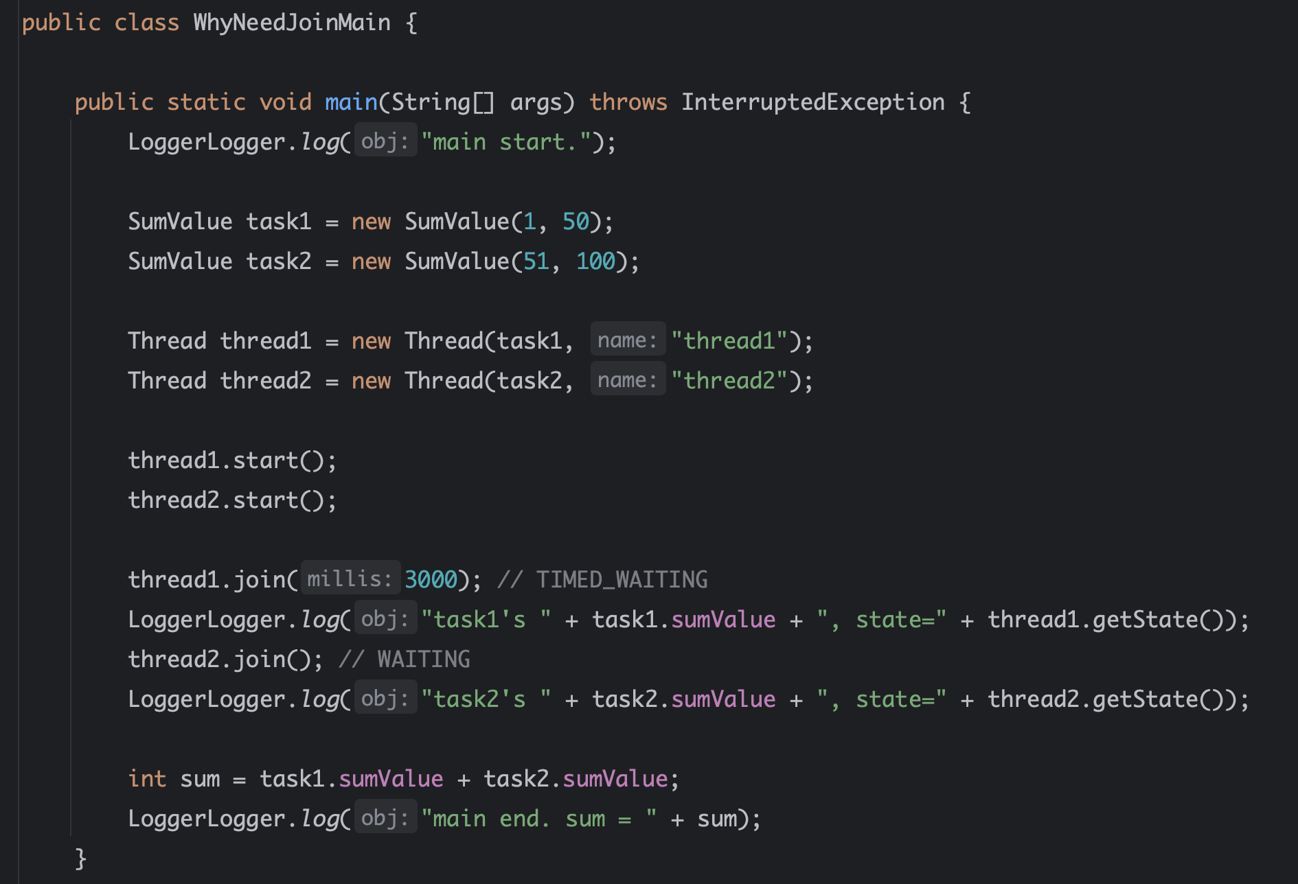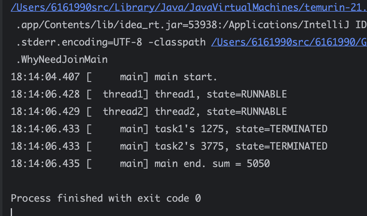 thread1 이 아직 종료되지 않았다면 main 플로우는 thread1.join() 코드 안에서 더는 진행하지 않고 멈추어 기다린다. 이후에 thread1이 종료되면 main 플로우의 스레드는 RUNNABLE 상태가 되고 다음 코드로 이동한다. thread1 이 종료되는 시점에 thread2 도 거의 같이 종료 되기 때문에 thread2.join() 은 대기하지않고 바로 빠져나온다. WAITING 상태는 이런 것이다. join() 을 호출하는 스레드는 대상 스레드가 TERMINATED 상태가 될 때 까지 대기한다. 대상 스레드가 TERMINATED 상태가 되면 호출 스레드는 다시 RUNNABLE 상태가 되면서 다음 코드를 수행한다.