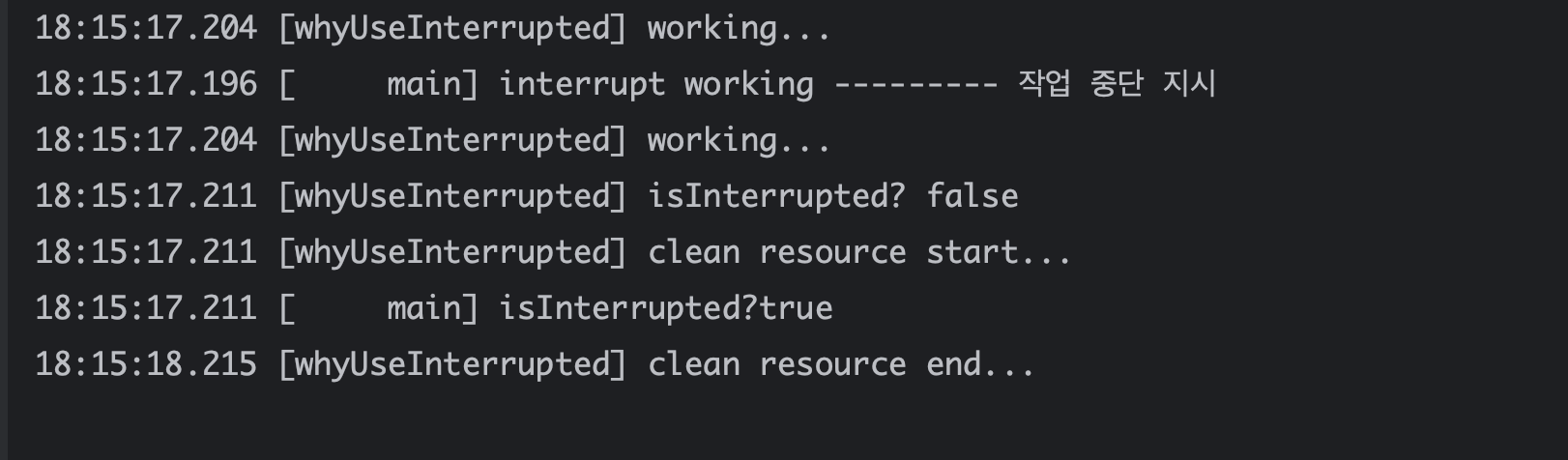 일단 대기 상태의 스레드를 RUNNABLE 상태로 전이시키는 또 다른 이벤트가 있다. 자고있는 스레드를 누군가가 깨우면된다. 다른 말로는 interrupted.