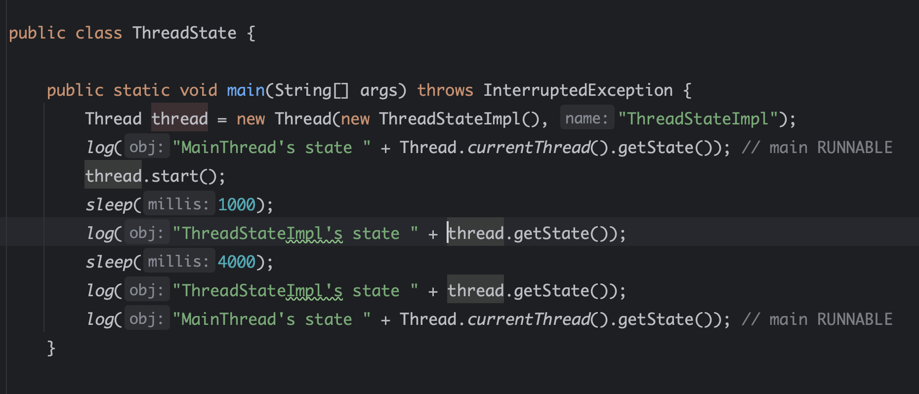 다음 코드에서 TIMED_WAITING 으로 전이될 수 있는 포인트가 있다. Thread.sleep(3000) 이다. sleep() 은 스레드를 잠시 멈추게 한다.실행을 일시 중단했다가 얼마의 시간이 지난 후 다시 재실행한다. 이 과정에서 스레드의 상태는 TIMED_WAITING -> RUNNABLE 로 전이된다. sleep() 말고도 TIMED_WAITING 상태에 머물게 하는 두 가지 기능이 더 있다. wait(long timeout), join(long millis) 이다. 상세하게 하는 일은 달라진다. sleep() 과 join() 에 대해서 비교하여 짚어보면, sleep() 은 지정된 시간 동안 멈춰있다가 다시 재실행하고 join() 은 다른 스레드의 종료를 기다렸다 재실행한다. 전자는 단순한 시간의 흐름에 따라 역할이 끝나지만 후자는 특정 스레드의 종료를 엿보는 역할까지 수행한다. 어찌됐든 둘 다 '일정 시간의 경과' 가 필요하다.