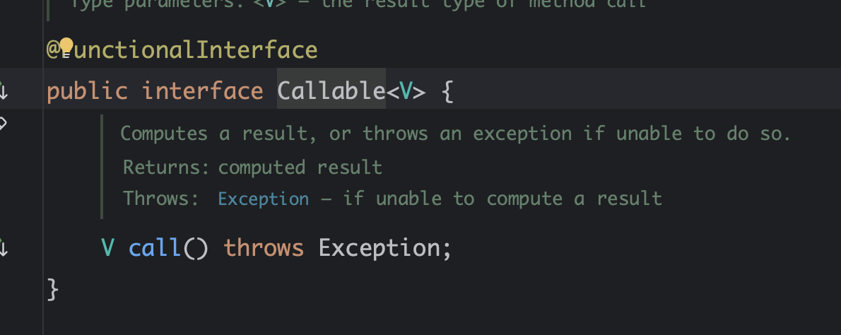 Future 는 두 가지 주요 유형의 작업을 처리할 수 있다. Callable 인터페이스는 작업을 수행한 후 결과를 반환한다. future.get() 이 해당 값을 반환하는 구조다. 이때 반환 타입은 Callable 이 정의한 제네릭 타입 V 다. Runnable 은 반환값이 없는 작업을 실행한다. 이 경우, Future 는 결과로 null 을 반환한다. 그래서 future.get() 을 호출해도 반환값이 null 인거다. Callable 로 변경해보았다.
