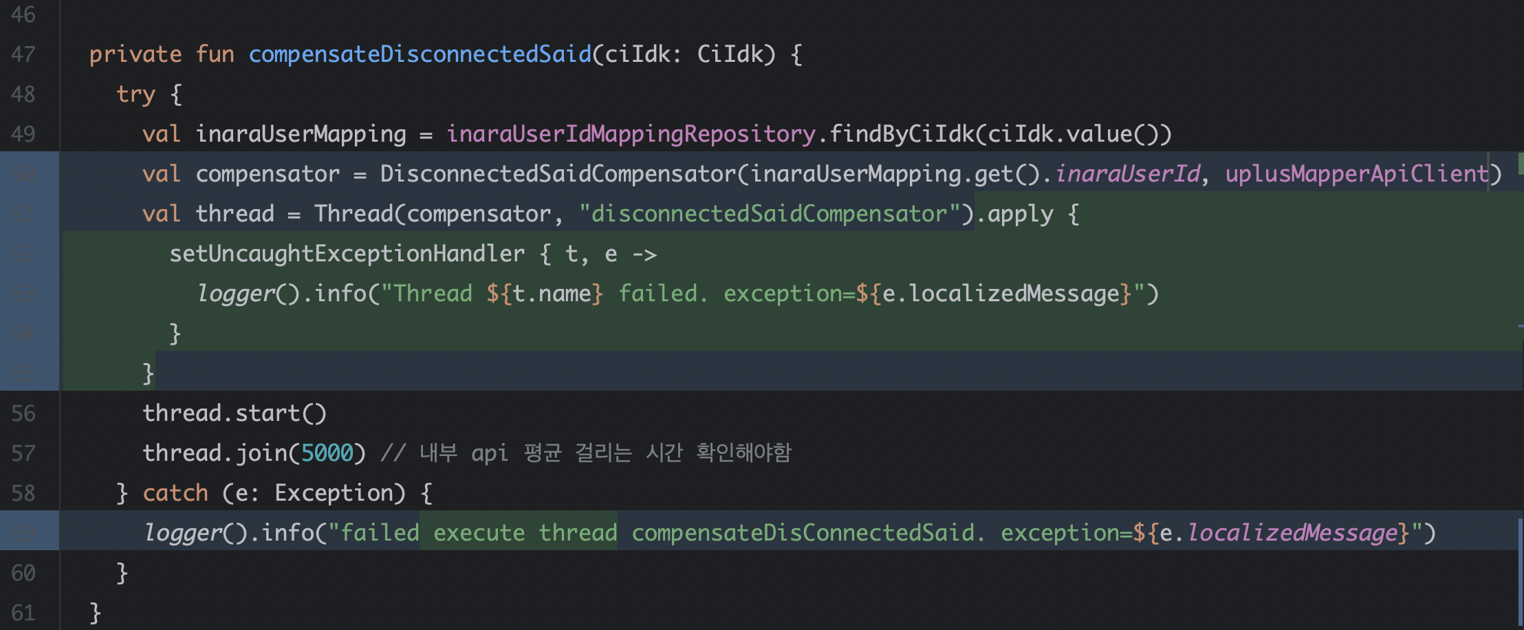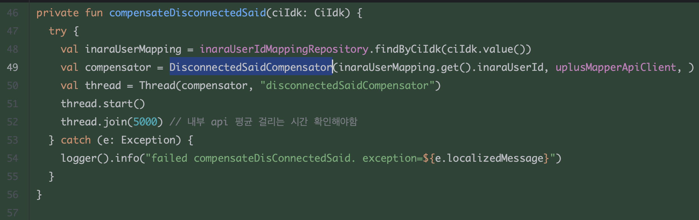 위 compensateDisconnectedSaid 메서드는 구독 처리 로직 안에 있다. 해당 메소드는 데이터 불일치를 확인하고 해결하는 DisconnectedSaidCompensator 와 협력한다. DisconnectedSaidCompensator 는 새로운 스레드에서 동작된다. 최대 5초 동안 작업 완료를 대기하다 5초가 지나면 작업이 완료되지 않더라도 메인 플로우의 대기 상태는 종료된다. 재연동이 완료되지않더라도 다음 플로우로 넘어가게 되는거다. 어쩔 수 없다. 재연동에 5초 이상의 시간을 허락할 수 없었다. 다행인 건 해당 구독 처리 프로세스는 비동기적으로 돌아가기 때문에 네트워크 타임아웃에 영향이 없었다.