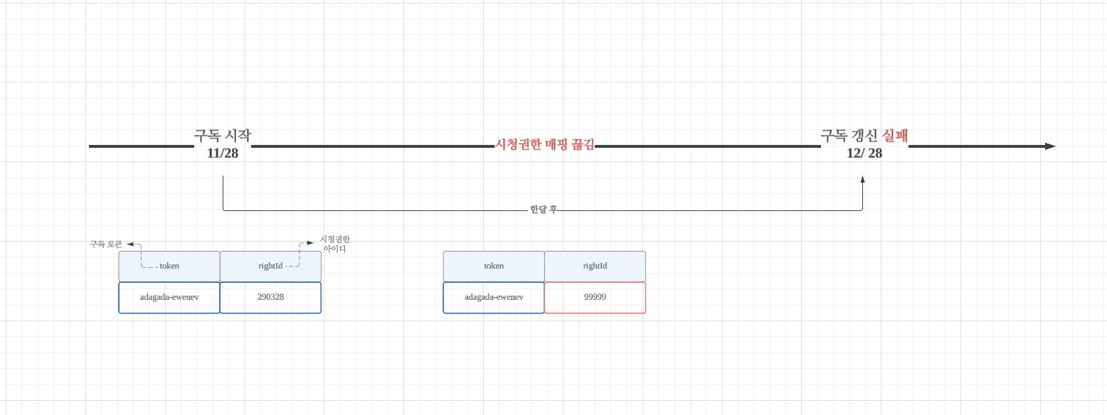 구독 데이터는 구독 토큰과 외부 클라이언트가 관리하는 시청권한 아이디로 매핑된다. 근데 매월 정기 결제 시점에 이 아이디가 변경되어있다면, 구독 토큰으로 이전 데이터를 조회할 수 없어 예외가 발생하고 결과적으로 구독 정기결제 이벤트 처리가 실패한다. 여러 요건 상, 해당 플로우에서 시청권한 아이디가 변경되었는지 체크해야했다. 변경되었다면 이전에 적재해둔 매핑 데이터를 재연동하는 프로세스가 필요했다.