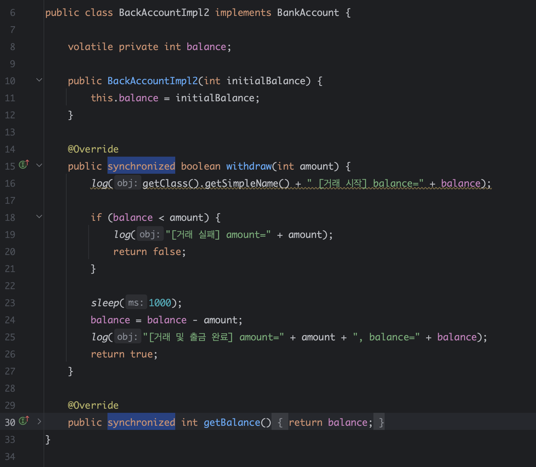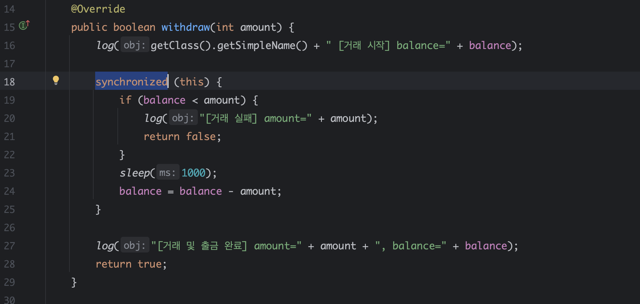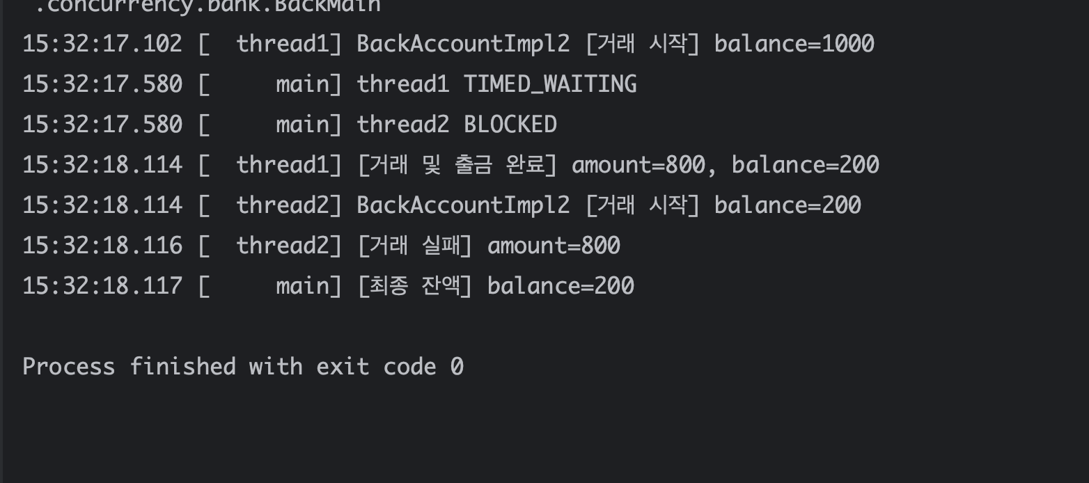 thread1 이 먼저 수행되면서 withdraw() 에 접근합니다. withdraw() 는 synchronized 메소드이므로 락이 필요합니다. 해당 락을 가지고있는 스레드가 존재하지 않으므로 thread1 이 락을 선점합니다. 뒤에 접근하려하는 thread2 는 인스턴스 락을 획득할 수 없으므로 thread1이 락을 반환할 때까지 대기합니다. thread1 이 공유자원을 locked 하여 thread2 가 blocked 된 상황이라고 볼 수 있습니다.