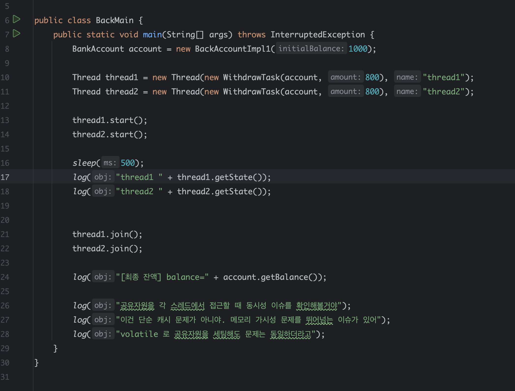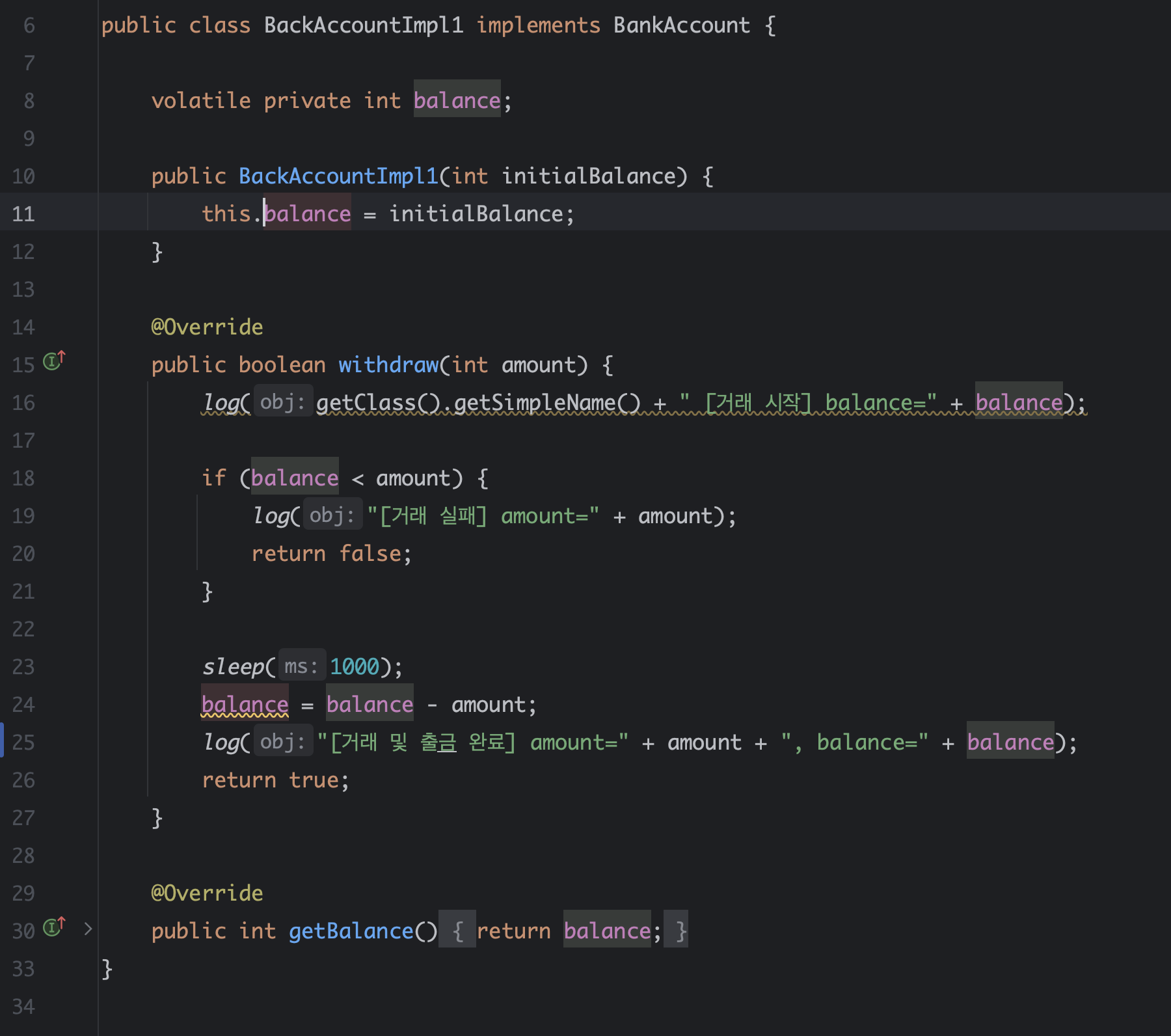 멀티스레드 환경에서 은행 계좌에서 출금 작업을 수행하며 발생할 수 있는 동시성 문제를 보여주는 예제입니다. thread1과 thread2가 각각 출금 작업을 시작합니다. 서로 다른 시점에 잔액 조건(balance >= amount)을 확인하고 잔액을 차감합니다. 두 스레드가 동시에 출금 작업을 수행하면, 어느 한 스레드가 잔액이 0 또는 음수가 될 가능성 존재합니다. 찰나의 순간 두 스레드 모두 조건을 통과하여 간발의 차이로 출금을 수행하면서 잔고가 마이너스 되어버리는 현상입니다.