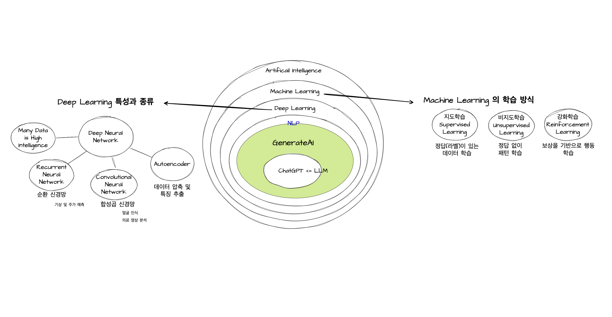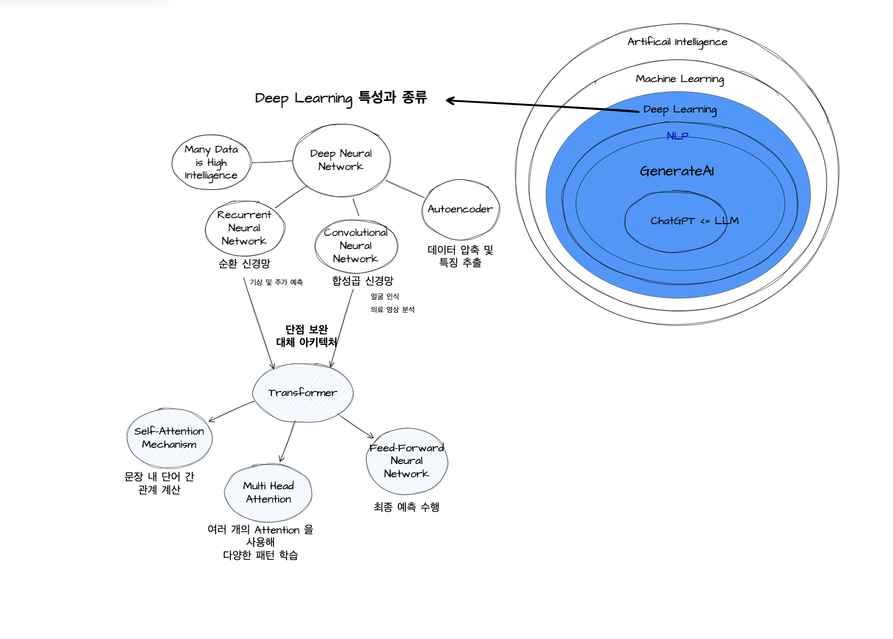 LLM이 계승하는 건 ML만이 아니다. DL의 특성도 관계가 있다. DL 은 데이터가 많을수록 더 딥해진다. 더 많은 데이터가 있을수록 더 많이 학습할 수 있다는 건, 당연하지만 당연하지않다. ML 은 그렇지 않기 때문이다. DL 은 자동으로 학습할 수 있는 프로세스를 가지고 있다. 데이터 내에서 중요 정보를 추출하고 패턴을 학습하며 인지 능력을 높인다. 이미지 같은 경우는 합성곱 신경망을, 텍스트 같은 경우는 순환 신경망을 타며 학습한다.