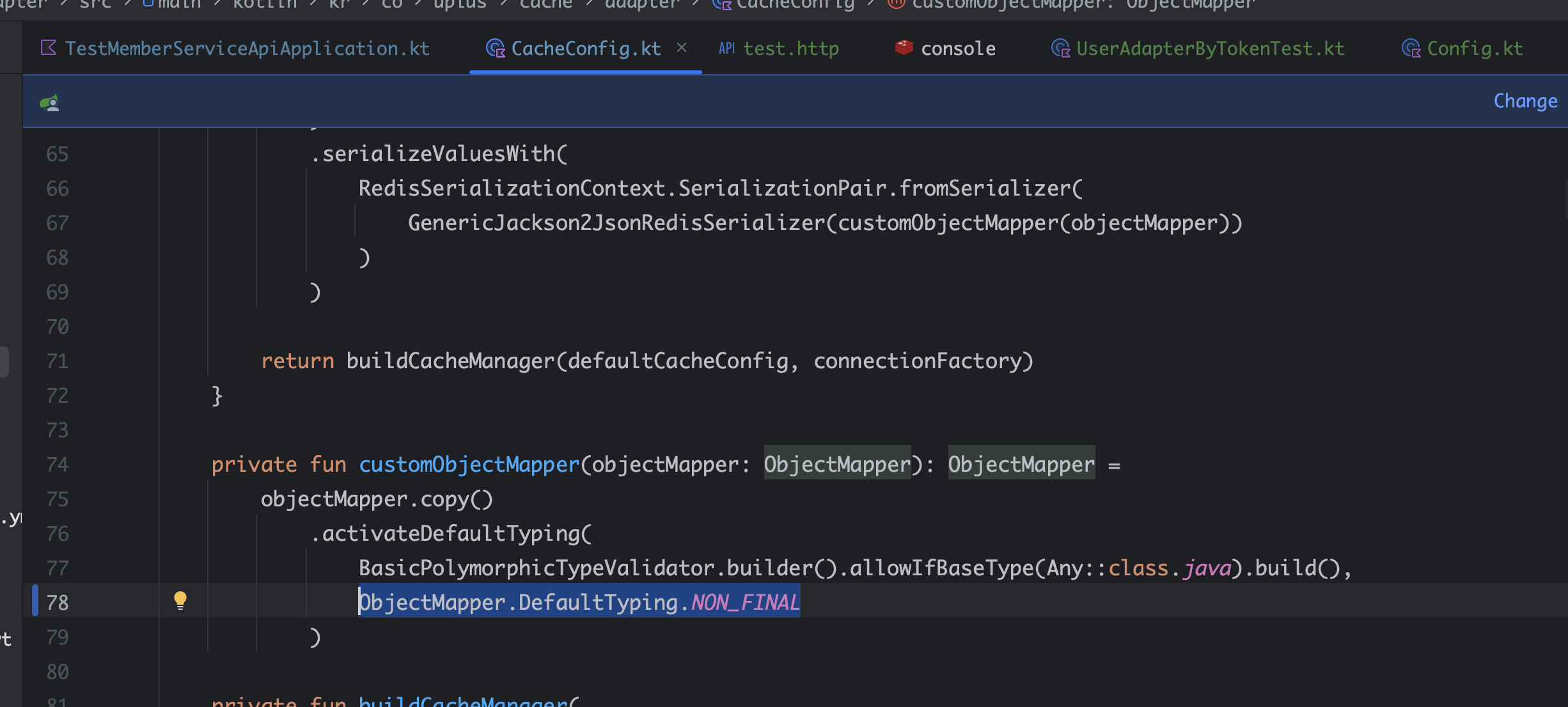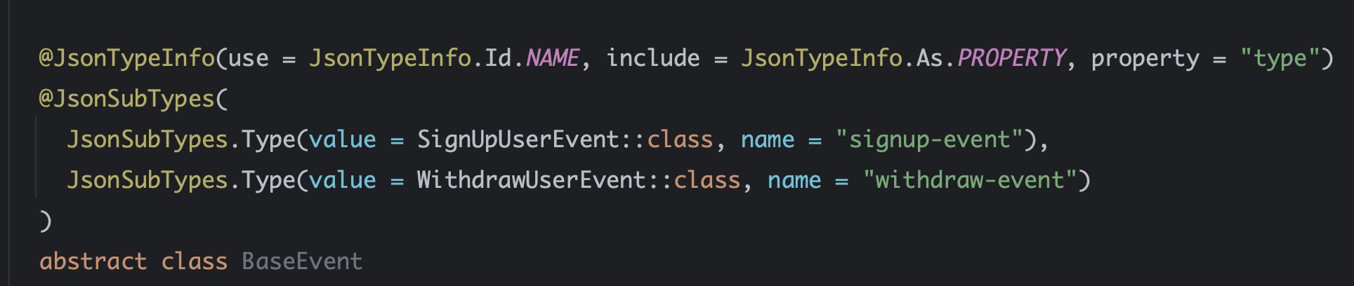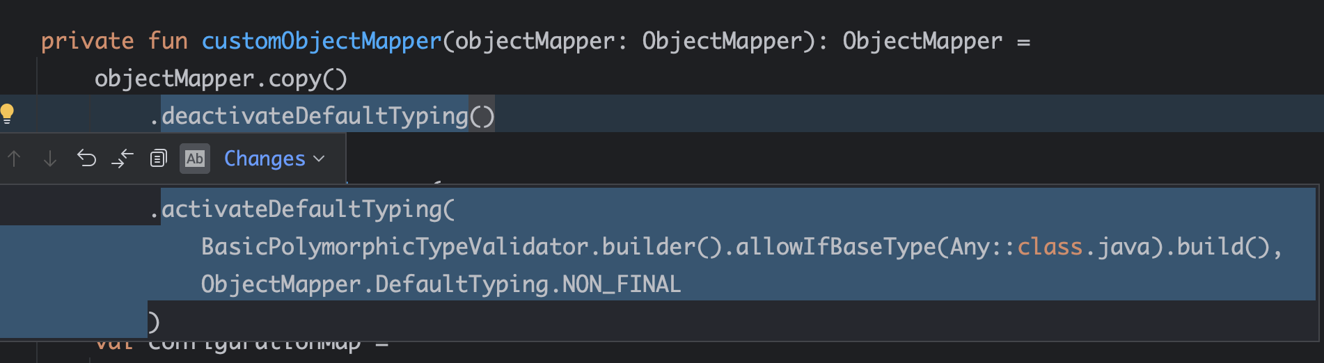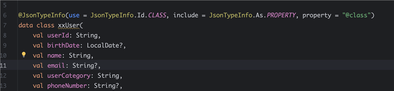 Kotlin은 모든 클래스와 메서드가 기본적으로 final이기 때문에, 이런 타입 바인딩 처리나 프록시 기반 AOP 적용 시 명시적으로 open을 붙여야 한다. 따라서 아래와 같이 수동 설정을 통해 Jackson이 클래스 타입 정보를 포함할 수 있도록 지정해주어야 한다:
