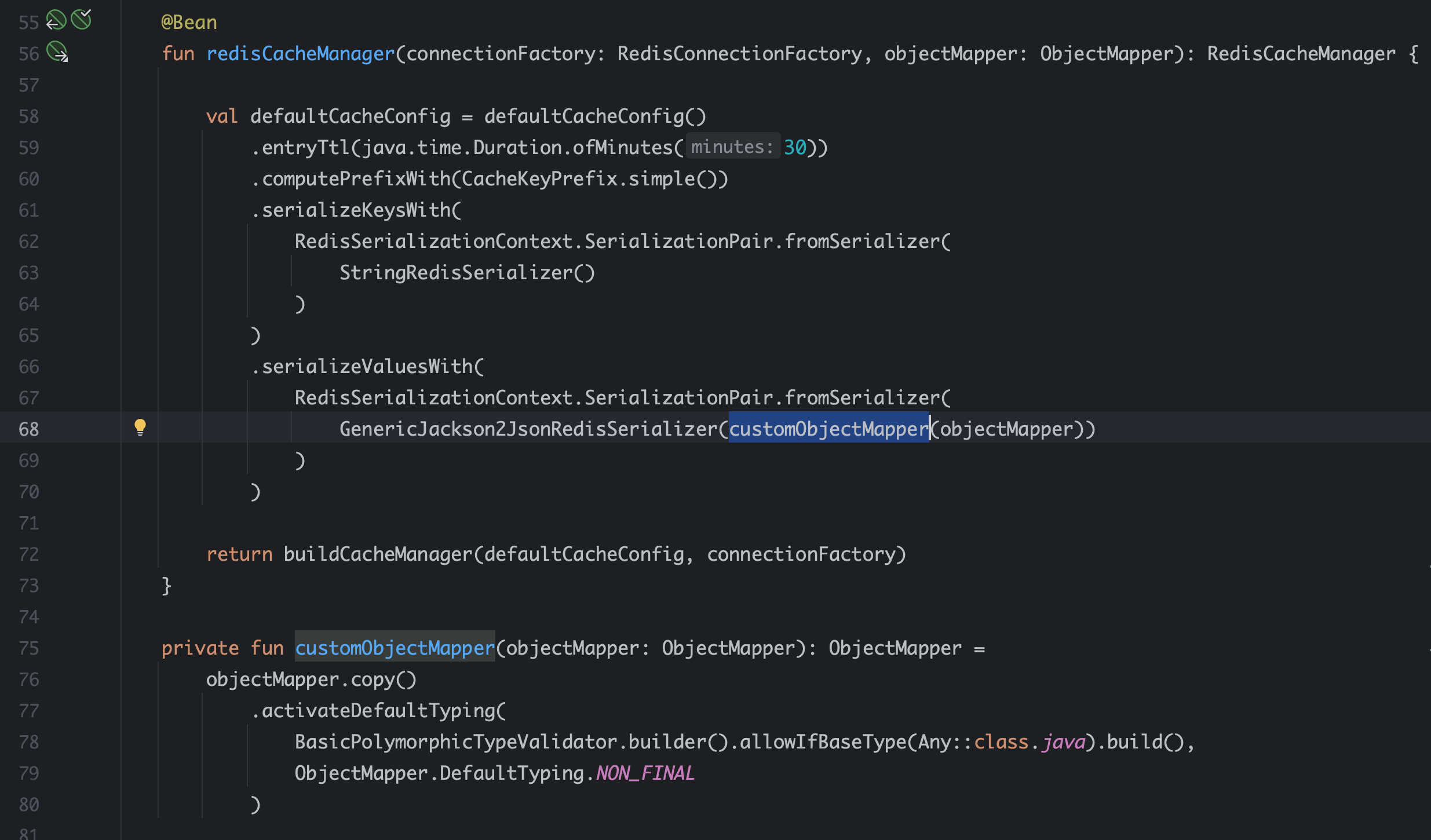 추가로 GenericJackson2JsonRedisSerializer 이용시 custom ObjectMapper 를 사용하면 주의해야할 점이 있다. ObjectMapper는 기본적으로 직렬화/역직렬화 시 class type 정보를 포함하지 않기 때문에, 직렬화된 데이터에는 type 정보가 존재하지 않는다. 또한 역직렬화 시에도 ObjectMapper가 type 정보를 모른 채 역직렬화를 진행하게 되고, 기본 타입인 LinkedHashMap으로 역직렬화 되어 에러가 발생한다. 결국 아래와 같은 세팅값이 필요하다.