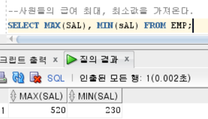 SELECT MAX(SAL), MIN(sAL) FROM EMP;