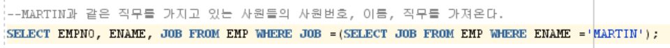 SELECT EMPNO, ENAME, JOB FROM EMP WHERE JOB =(SELECT JOB FROM EMP WHERE ENAME ='MARTIN');