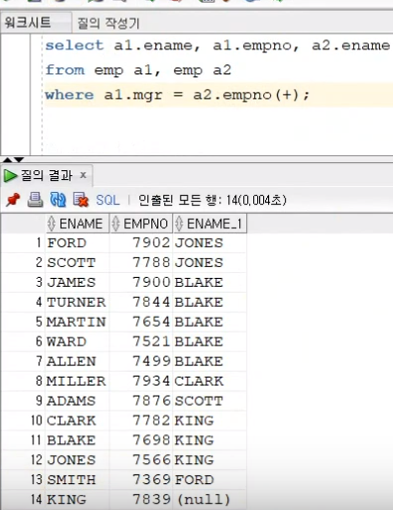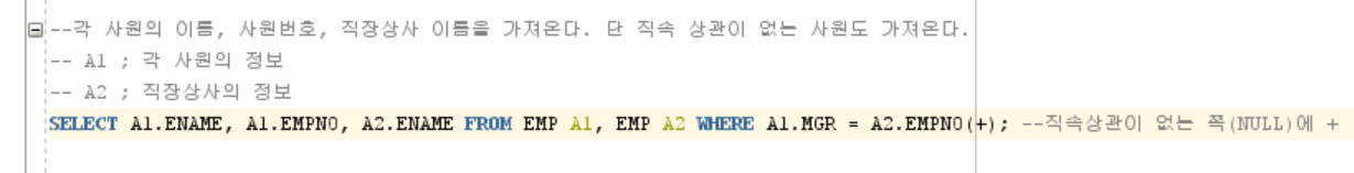 SELECT A1.ENAME, A1.EMPNO, A2.ENAME FROM EMP A1, EMP A2 WHERE A1.MGR = A2.EMPNO(+);