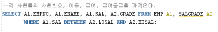 SELECT A1.EMPNO, A1.ENAME, A1.SAL, A2.GRADE FROM EMP A1, SALGRADE A2 WHERE A1.SAL BETWEEN A2.LOSAL AND A2.HISAL;