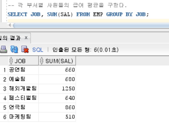 SELECT JOB, SUM(SAL) FROM EMP GROUP BY JOB;