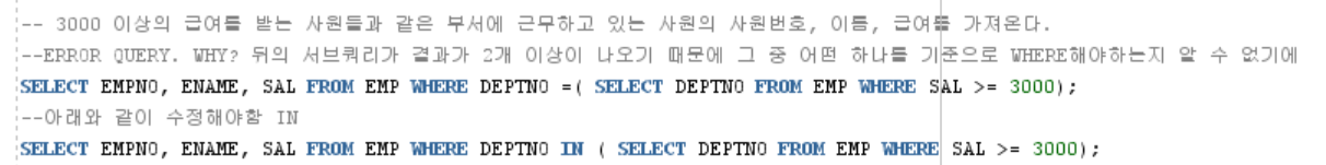 --ERROR QUERY. WHY? ๋ค์ ์๋ธ์ฟผ๋ฆฌ๊ฐ ๊ฒฐ๊ณผ๊ฐ 2๊ฐ ์ด์์ด ๋์ค๊ธฐ ๋๋ฌธ์ ๊ทธ ์ค ์ด๋ค ํ๋๋ฅผ ๊ธฐ์ค์ผ๋ก WHEREํด์ผํ๋์ง ์ ์ ์๊ธฐ์