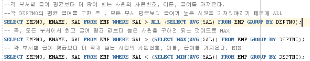 --๊ฐ DEPTNO์ ํ๊ท ๊ธ์ฌ๋ฅผ ๊ตฌํ ํ , ๋ชจ๋ ๋ถ์ ํ๊ท ๋ณด๋ค ๊ธ์ฌ๊ฐ ๋์ ์ฌ์์ ๊ฐ์ ธ์์ผํ๊ธฐ ๋๋ฌธ์ ALL