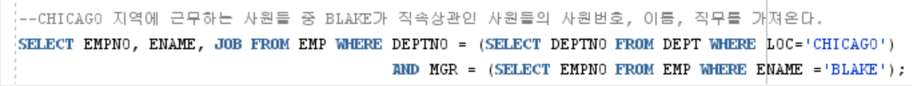SELECT EMPNO, ENAME, JOB FROM EMP WHERE DEPTNO = (SELECT DEPTNO FROM DEPT WHERE LOC='CHICAGO') AND MGR = (SELECT EMPNO FROM EMP WHERE ENAME ='BLAKE');