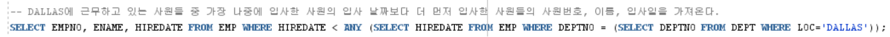 SELECT EMPNO, ENAME, HIREDATE FROM EMP WHERE HIREDATE < ANY (SELECT HIREDATE FROM EMP WHERE DEPTNO = (SELECT DEPTNO FROM DEPT WHERE LOC='DALLAS'));