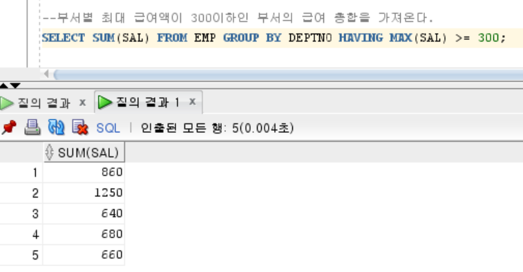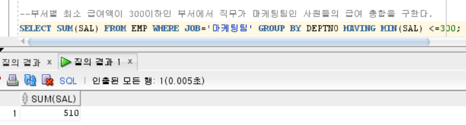 SELECT SUM(SAL) FROM EMP WHERE JOB='๋ง์ผํ ํ' GROUP BY DEPTNO HAVING MIN(SAL) <=300;