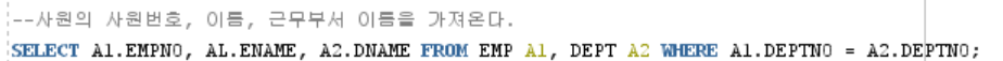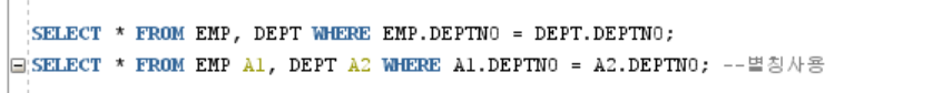 SELECT * FROM EMP A1, DEPT A2 WHERE A1.DEPTNO = A2.DEPTNO; --๋ณ์นญ์ฌ์ฉ