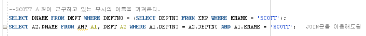 SELECT A2.DNAME FROM AMP A1, DEPT A2 WHERE A1.DEPTNO = A2.DEPTNO AND A1.ENAME = 'SCOTT';