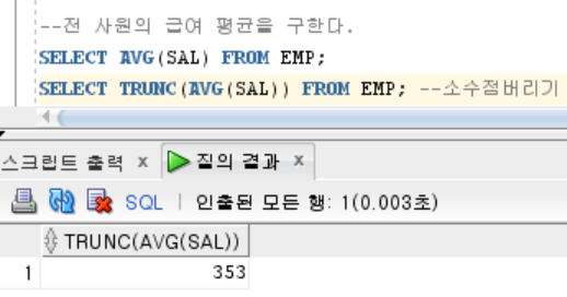 SELECT AVG(SAL) FROM EMP; SELECT TRUNC(AVG(SAL)) FROM EMP; --์์์ ๋ฒ๋ฆฌ๊ธฐ