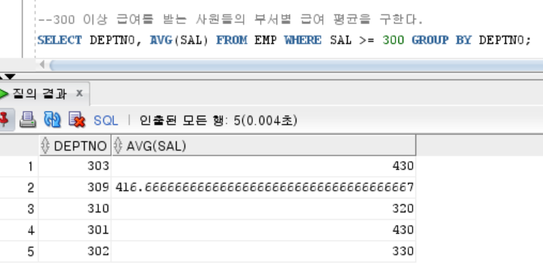 SELECT DEPTNO, AVG(SAL) FROM EMP WHERE SAL >= 300 GROUP BY DEPTNO;