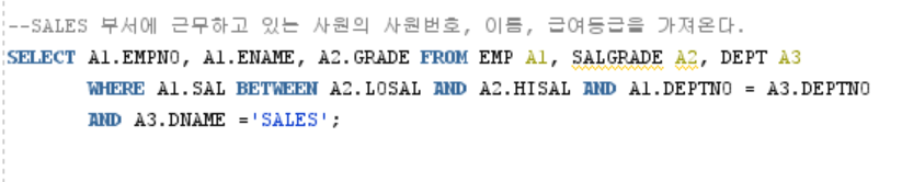 SELECT A1.EMPNO, A1.ENAME, A2.GRADE FROM EMP A1, SALGRADE A2, DEPT A3 WHERE A1.SAL BETWEEN A2.LOSAL AND A2.HISAL AND A1.DEPTNO = A3.DEPTNO AND A3.DNAME ='SALES';