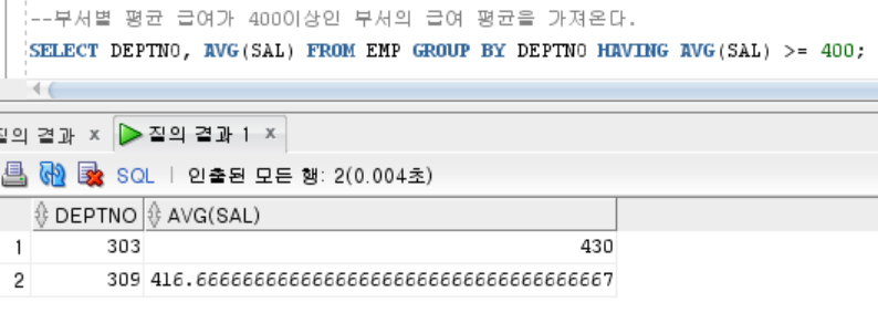 SELECT DEPTNO, AVG(SAL) FROM EMP GROUP BY DEPTNO HAVING AVG(SAL) >= 400;