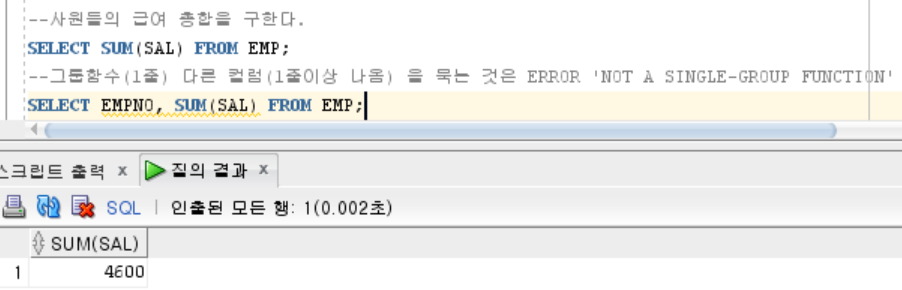 SELECT EMPNO, SUM(SAL) FROM EMP; --ERROR