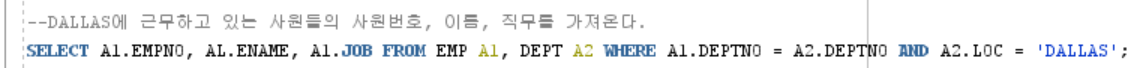 SELECT A1.EMPNO, AL.ENAME, A1.JOB FROM EMP A1, DEPT A2 WHERE A1.DEPTNO = A2.DEPTNO AND A2.LOC = 'DALLAS';