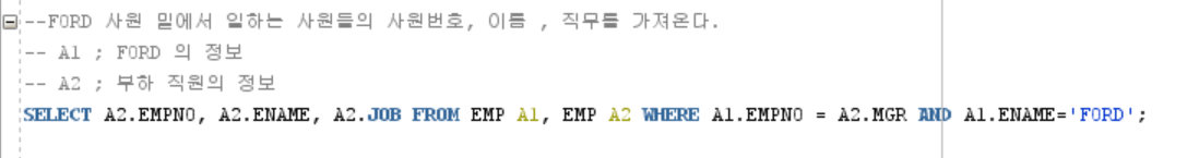 -- A2 ; ๋ถํ ์ง์์ ์ ๋ณด SELECT A2.EMPNO, A2.ENAME, A2.JOB FROM EMP A1, EMP A2 WHERE A1.EMPNO = A2.MGR AND A1.ENAME='FORD';