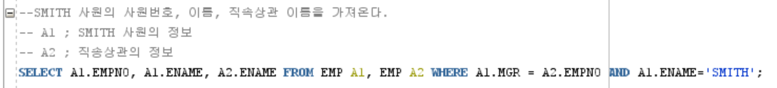 SELECT A1.EMPNO, A1.ENAME, A2.ENAME FROM EMP A1, EMP A2 WHERE A1.MGR = A2.EMPNO AND A1.ENAME='SMITH';