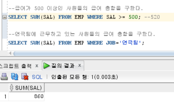 SELECT SUM(SAL) FROM EMP WHERE SAL >= 500; --520