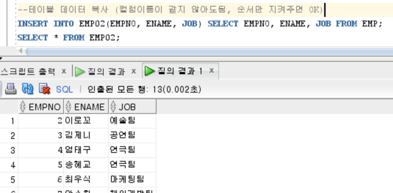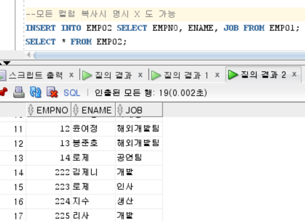 INSERT INTO EMP02 SELECT EMPNO, ENAME, JOB FROM EMP01; SELECT * FROM EMP02;